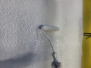 上塗り作業では、ローラーを使用してモルタル外壁全体に塗料を塗布していきます。