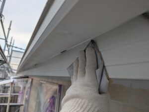 軒天全体に塗料を塗り広げ、上塗り1回目の作業を完了しました。